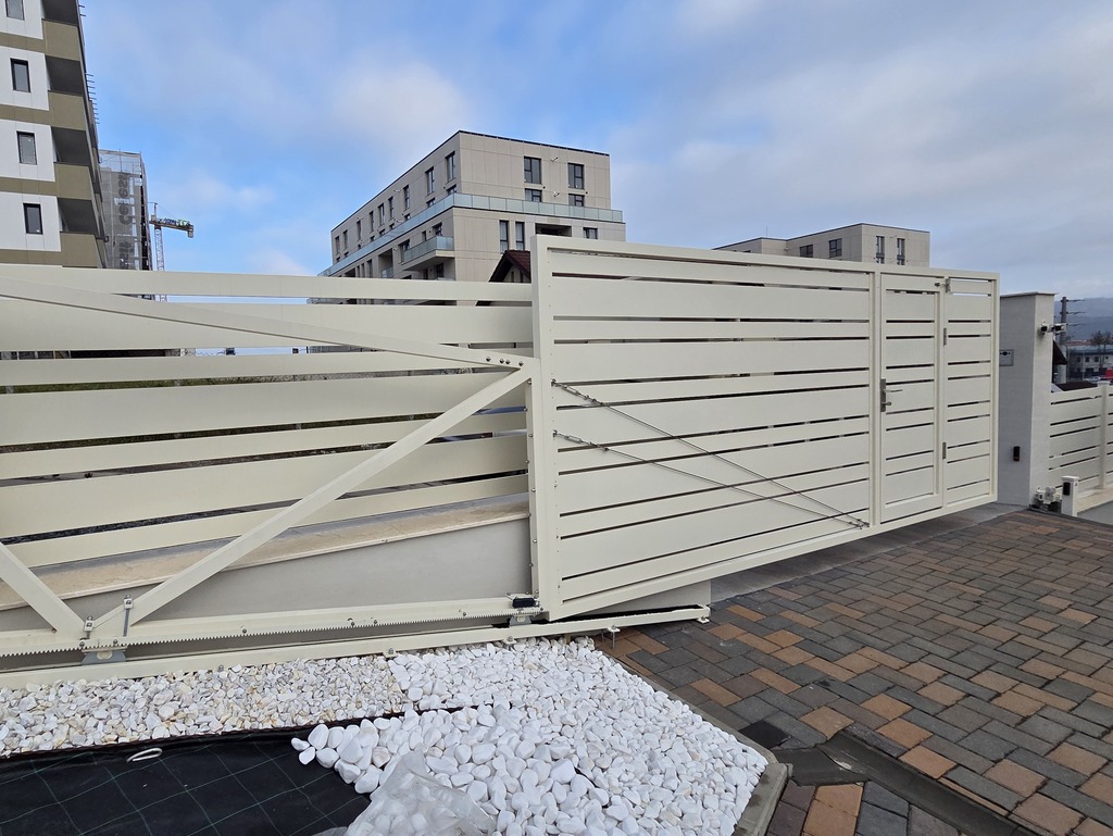 În acest proiect am demonstrat încă o dată că pentru noi „nu se poate” nu există. Deși terenul este înclinat, pentru a optimiza spațiul curții am ales o poartă culisantă suspendată, soluție care elimină problemele create de diferențele de nivel.